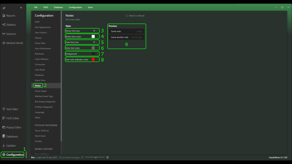 To open the notes appearance editing menu in the main Hand2Note window, find the “Configuration” label (1) and click on it. Then select the “Notes” menu (2).