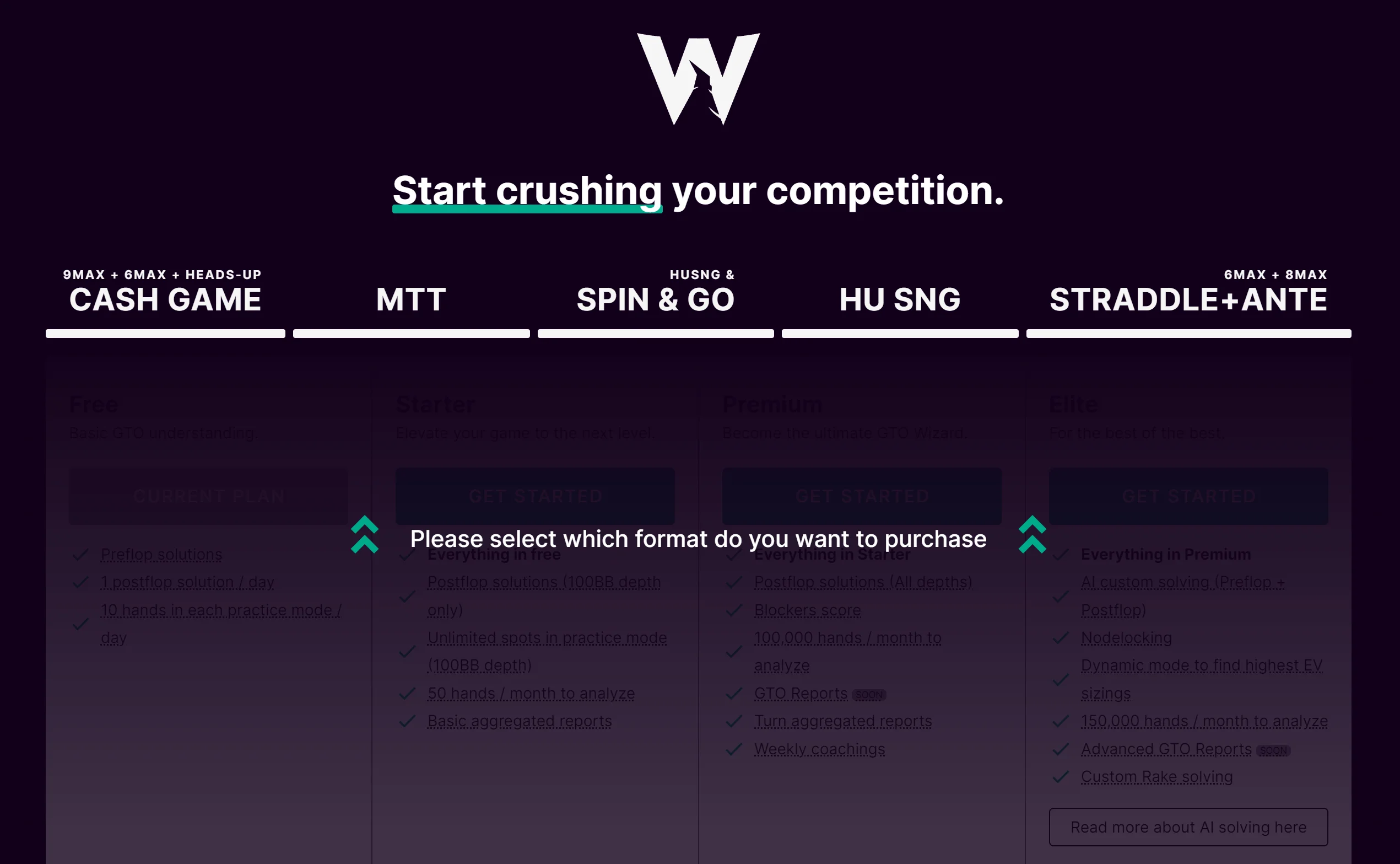 每种游戏类型提供五个订阅计划:Free、Starter、Premium、Elite 和 Ultra。它们在功能、分析限额和求解器能力方面有所不同。