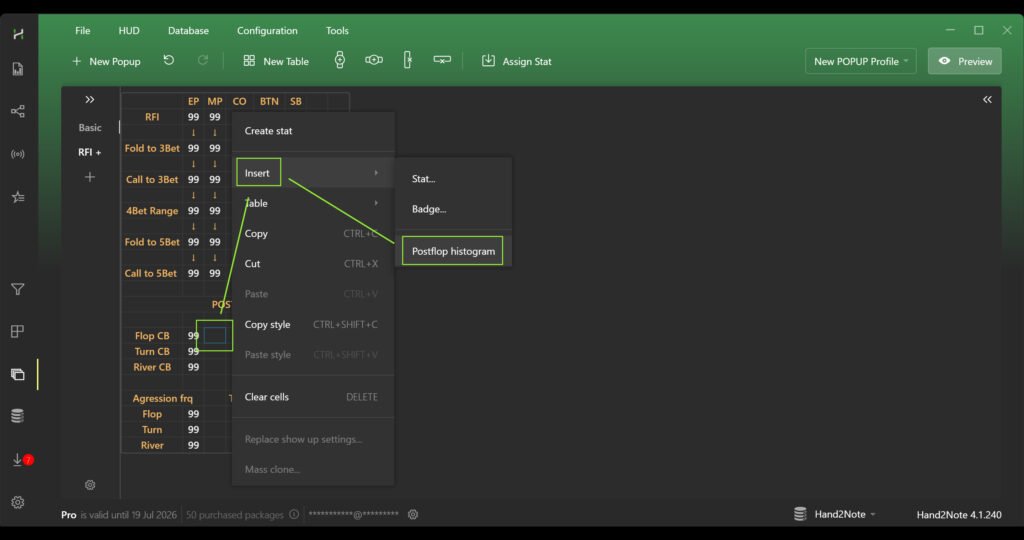 要添加直方图,右键点击目标单元格。在弹出的菜单中,将鼠标悬停在“Insert”上,然后从下拉列表中选择“Postflop histogram”。