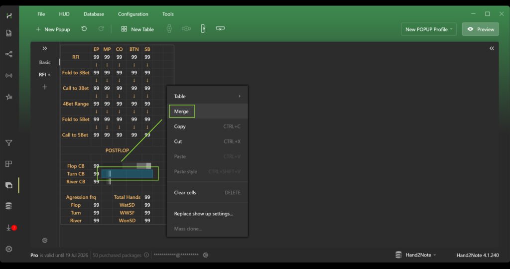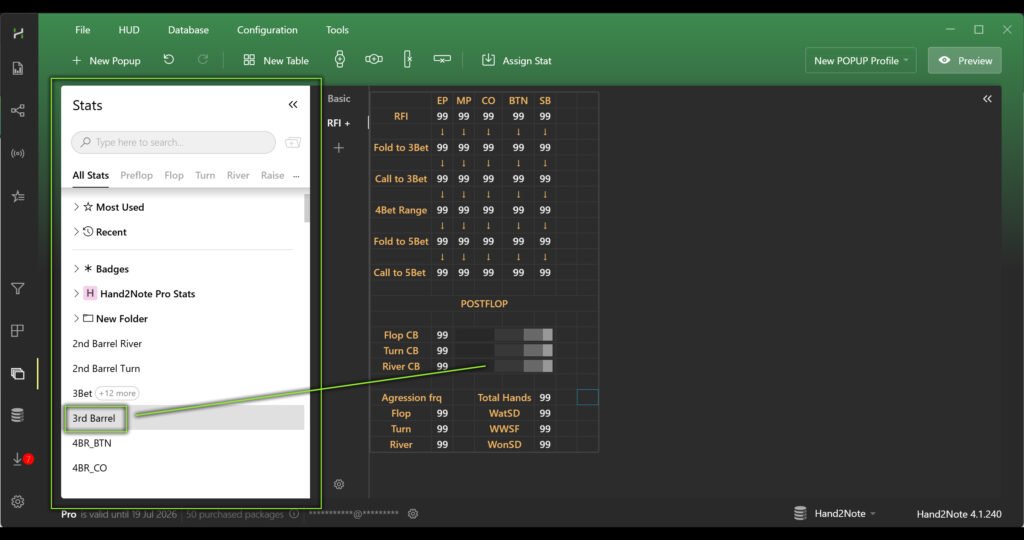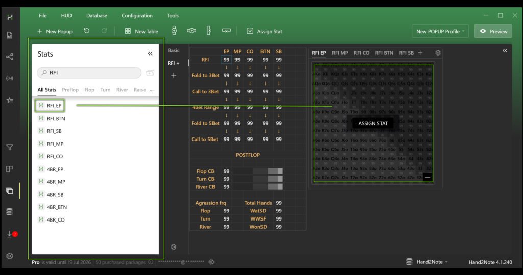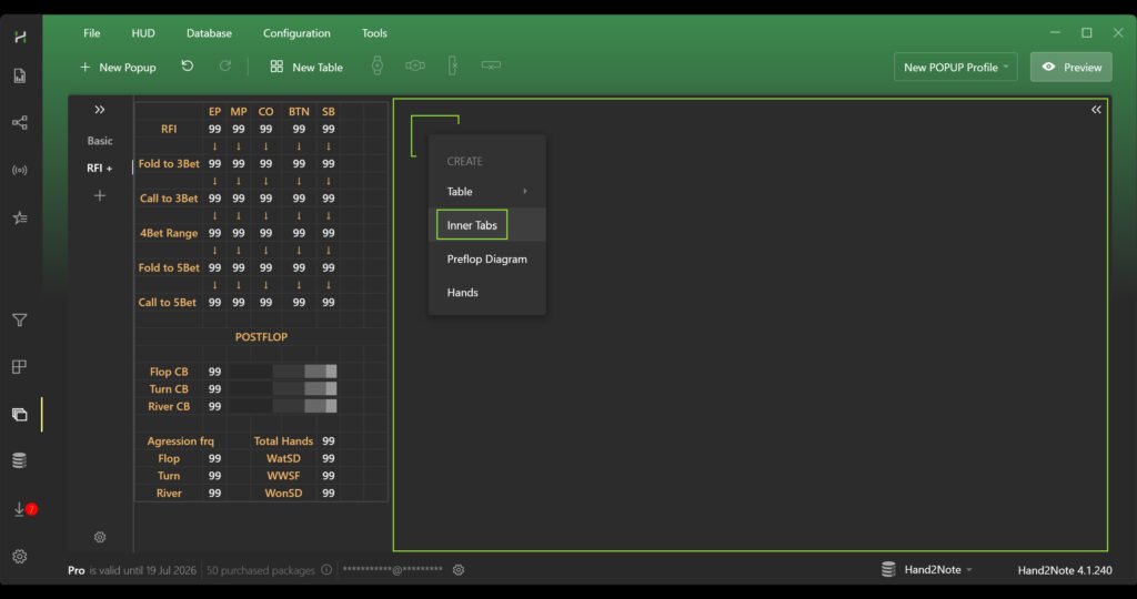 使用文章“Hand2Note Popup Editor:创建简单弹窗”中介绍的方法,在弹窗中创建一个新的标签页,为其应用弹窗面板,并填入所需的统计数据和标签。需要注意的是,在本示例中,我们已提前创建好所需的统计项。以下是新建“RFI+”标签页的示例:
