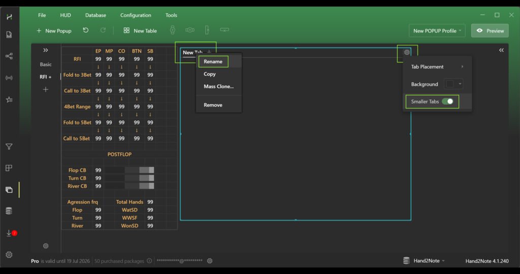 接下来调整外观:为了让标签更紧凑,点击右上角的齿轮图标并启用“Smaller Tabs”。然后创建所需数量的标签页并重命名——点击标签名称并选择“Rename”,再设置一个方便的名称。对每个标签重复这些步骤,例如:“RFI EP”、“RFI MP”、“RFI CO”、“RFI BTN”、“RFI SB”。