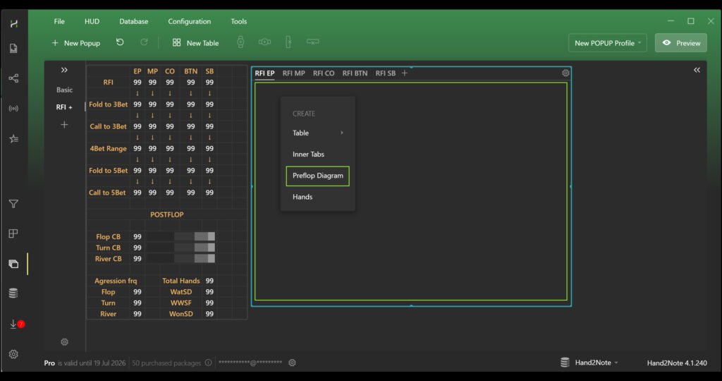 现在需要为每个创建的内部标签页添加翻前范围图。为此,在目标标签页内的空白区域右键点击,并选择“Preflop Diagram”。