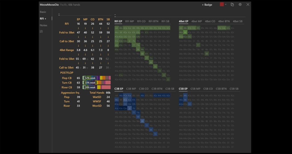 首先,通过可视化的翻牌后直方图来展示持续下注频率,使界面更加直观;随后构建了内部标签页系统。借助这些标签页,可以同时展示多个翻前范围图并进行清晰的结构化组织。最终得到的是一个紧凑而强大的工具:不再是零散的数据,而是直观的范围展示和关键进攻行为,让分析更加快速且精准。
