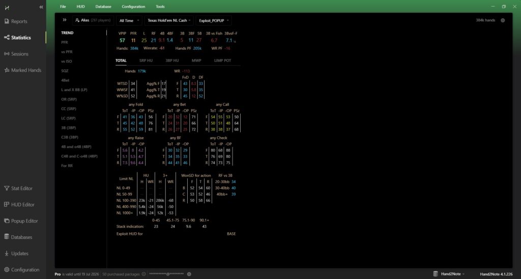 计算完成后,Hand2Note将显示一个活动的弹出窗口(示例中显示的是项目开发的弹出窗口:“Exploit HUD”),其中包含符合指定标准的所有玩家的汇总信息,呈现为单个档案。