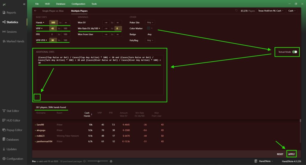 • 在右下方,将Hand2Note配置的额外统计过滤方法切换到«Textual mode»