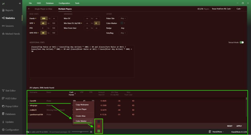 3. 添加标签。返回到«Multiple Players»窗口,你可以在数据库中找到符合被动鱼标准的真实对手,并用彩色标记标记他们(例如,红色或绿色)。现在在桌上,他们可以立即被识别,并调整你的策略。