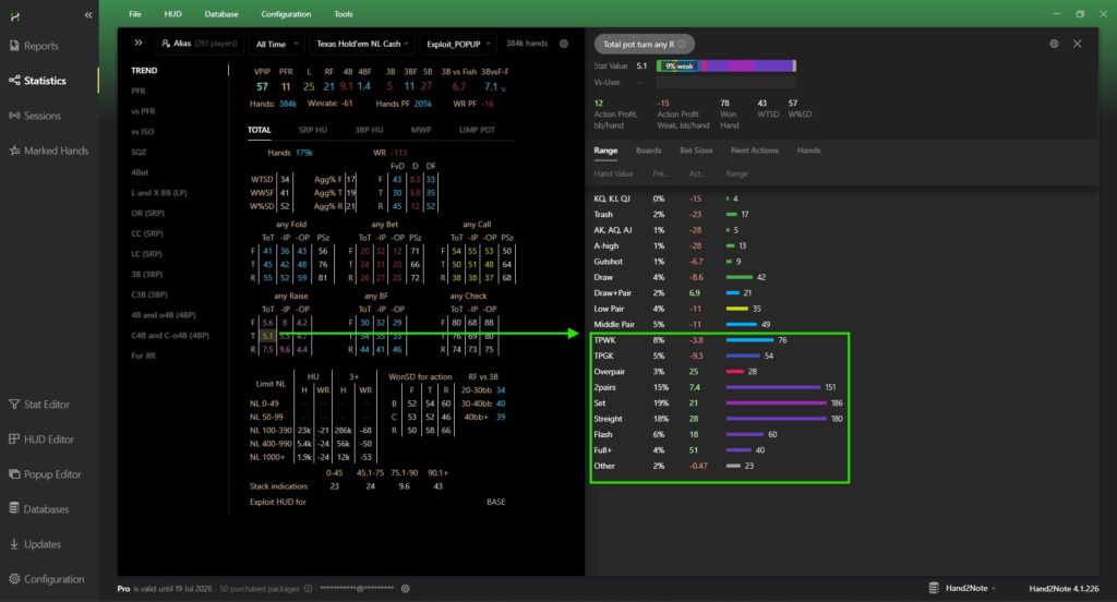 通过左键单击任何这些统计数据,你可以研究玩家在执行嵌入统计的动作时的手牌强度。这些填充和澄清是基于玩家的行动和摊牌时揭示的手牌构建的。